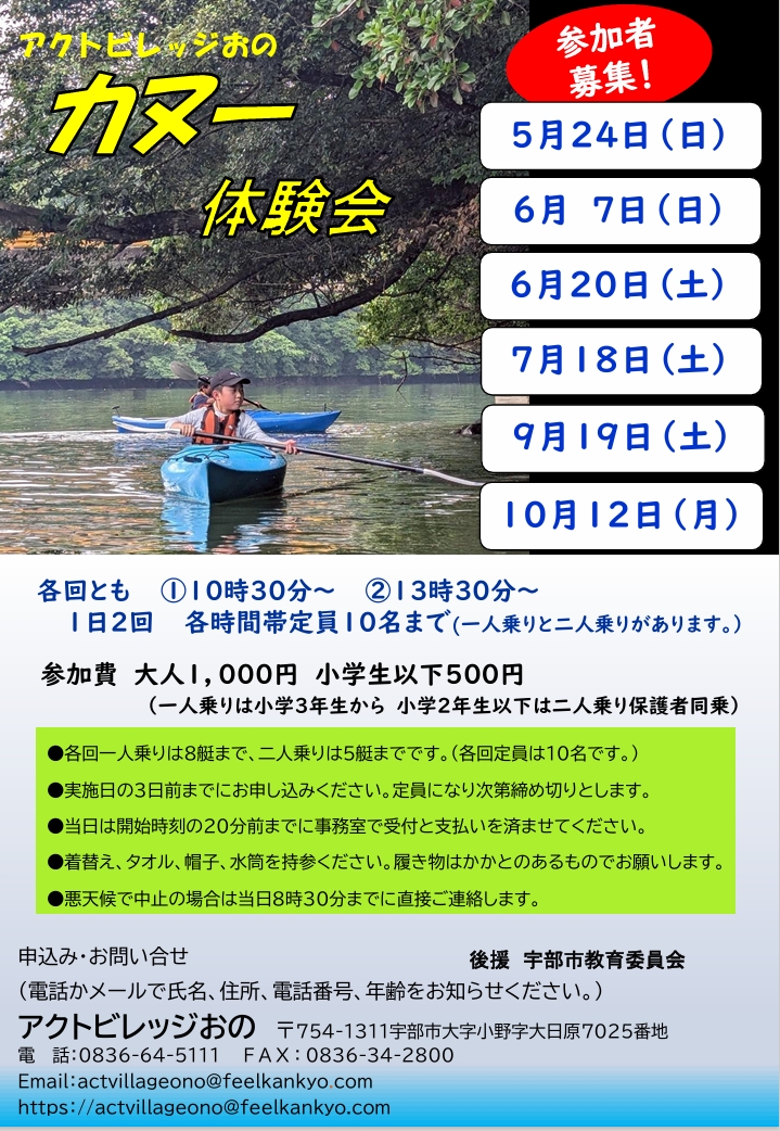 一人乗りと二人乗りのカヌーをご用意しています。一人乗りは小学校3年生以上からとします。